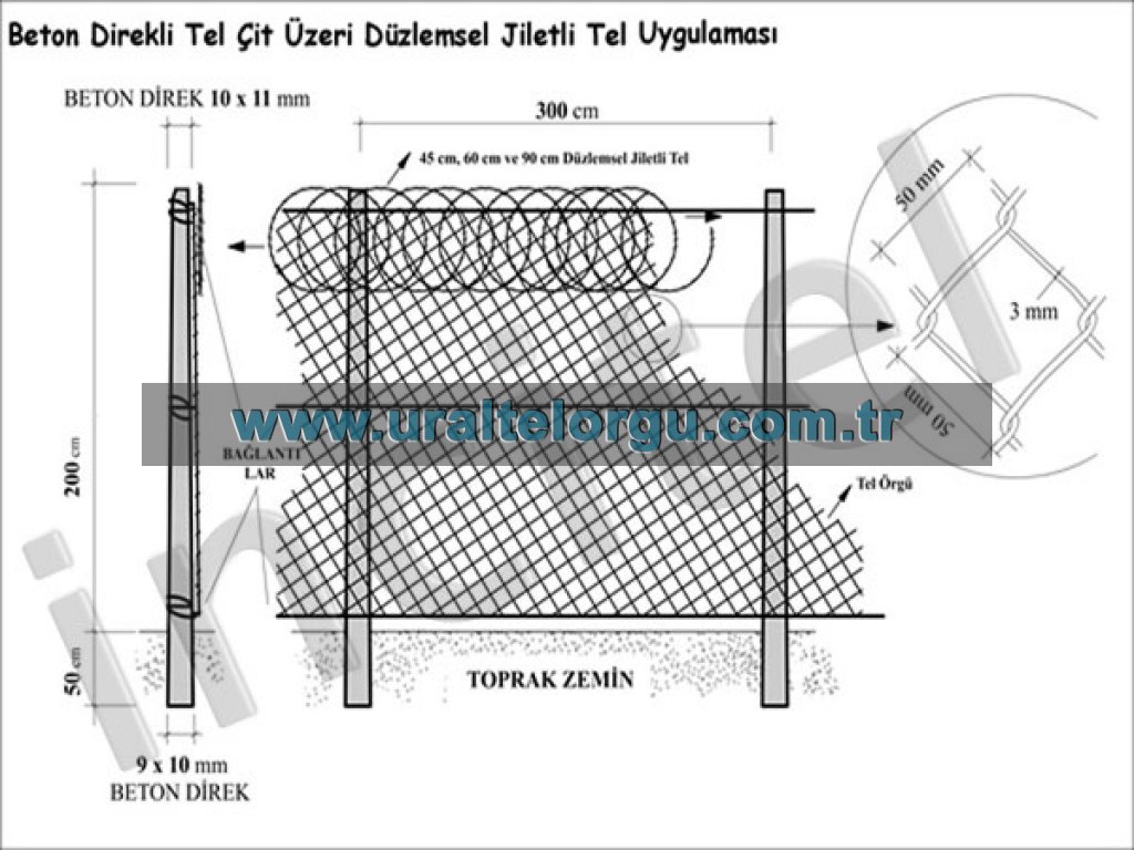 Düzlemsel Jiletli tel sistemleri yüksek güvenlik amacıyla kullanılmaktadır. Malzeme hammaddesi Galvaniz, 430 Kalite paslanmaz ve 304 Kalite Paslanmaz şeklinde 3 çeşit olarak üretilmektedir.